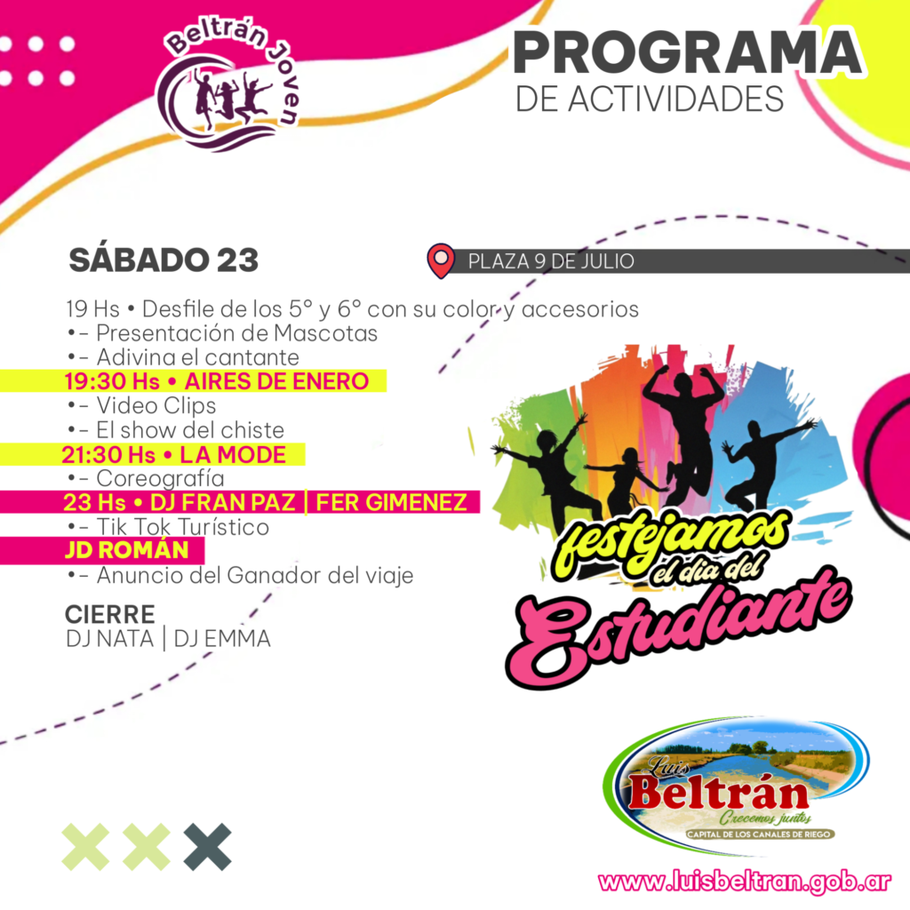 La Municipalidad de Luis Beltrán tiene el agrado de invitar a la comunidad a disfrutar de dos grandes eventos que se realizaran en el marco del programa “Beltrán Joven” para el 21 “Esperando la Primavera con los Estudiantes” y sábado 23 de septiembre la “Fiesta del Estudiante 2023”.